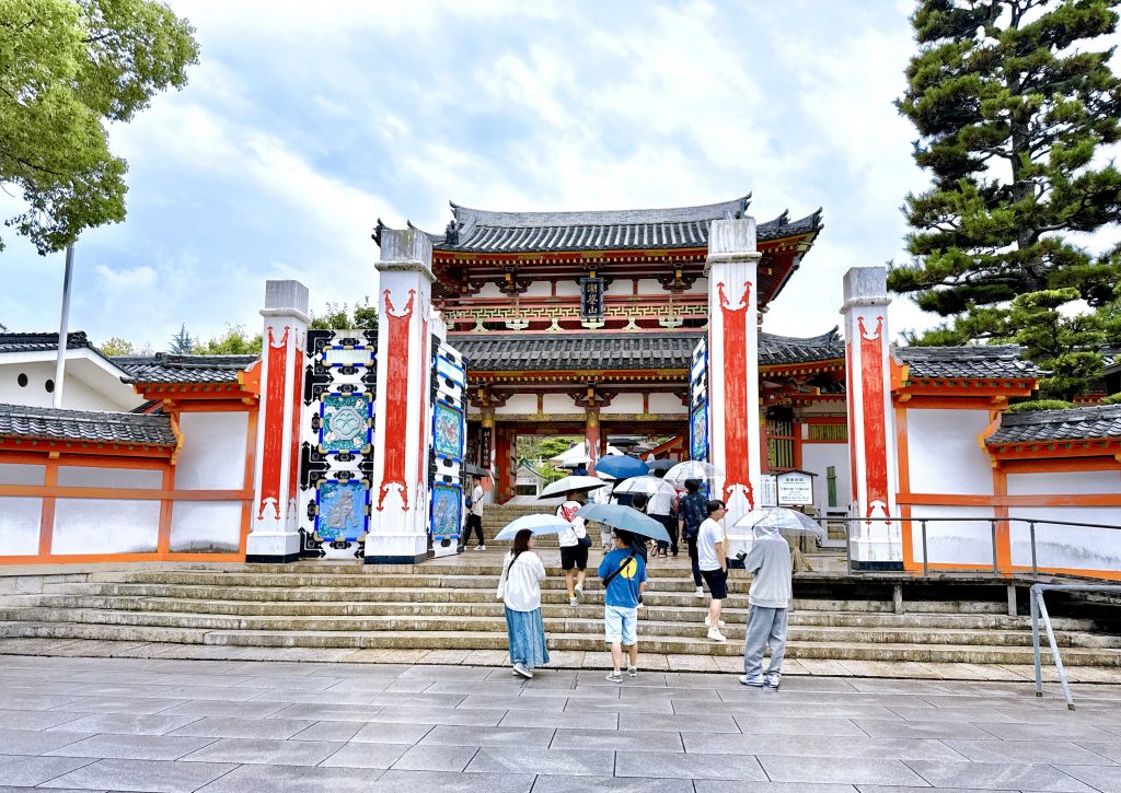 当寺伽藍配置の中心軸線上の最前に建つ門であり、総門に相当。京都御所・紫宸殿の御門(白木造り)と同じ様式。大方を鋼鉄で造っており、その上に朱を塗りこんでいる。扉表面の龍と波と狛犬の浮彫は、京都画壇の帝展特選作家故、川上拙以画伯の構想による下図をもとに彫刻。また、貫や扉の桟などは木造建築と錯覚するほど精巧にできている。