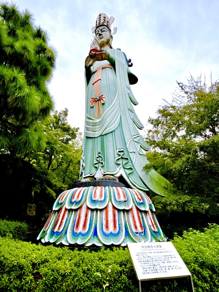本堂東翼廊の左、八角円堂の後方に造顕されている、奈良・法隆寺夢殿の御本尊、秘仏救世観音が手本。像高だけで10m(33尺3寸)あり、宝冠、台座などを加えた総高は15mにもなる大露仏。