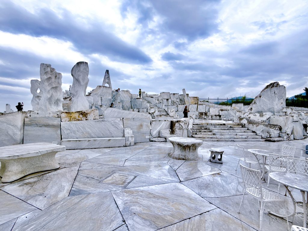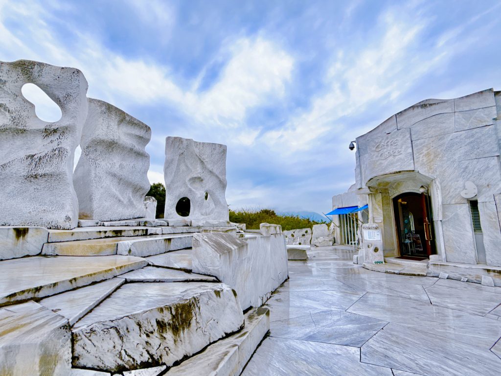 ここに使用されている大理石のすべては氏のアトリエがあるイタリア・カッラーラで採掘し、コンテナ船で運搬。周囲の景色の形や色、風雨、光といったあらゆる自然との調和(バランス)も考えて創造された。